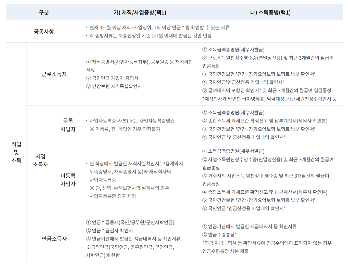 최저신용자 특례보증을 신청할 때 필요한 서류들이 있습니다. 공통사항도 있고 직업별로 필요서류에 차이가 있으니 아래 표(사진)를 확대해서 꼭 확인해보시기 바랍니다.